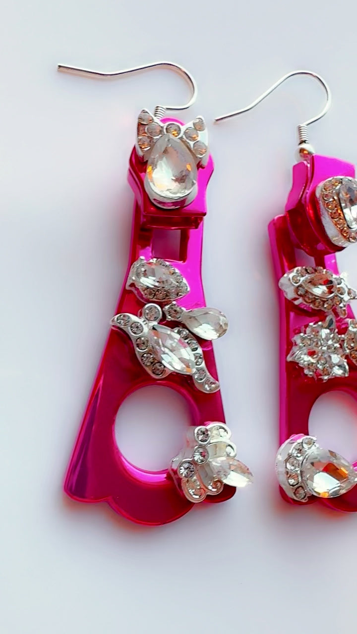 Soderena Original Design Earrings….hot pink metal zipper pull ear candy with rhinestones. Perfect with that favorite pair of jeans or dressed up with a black mini dress!