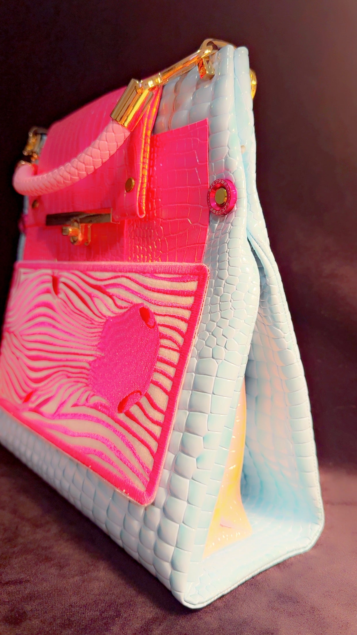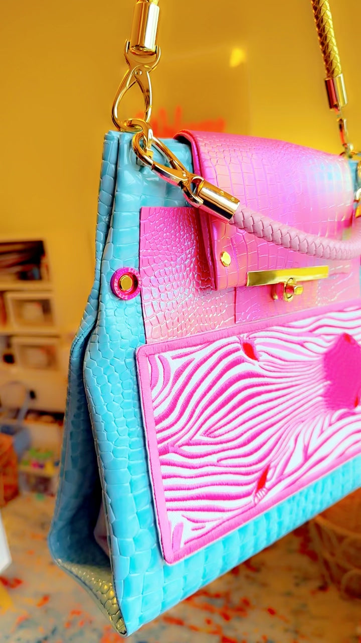 Handmade Soderena Original Handbag with pink blue and white vinyl with Zebra Embroidered Detail and gold and pink braided leather straps. Pink washer detail with twist clasp closure. One Of A Kind