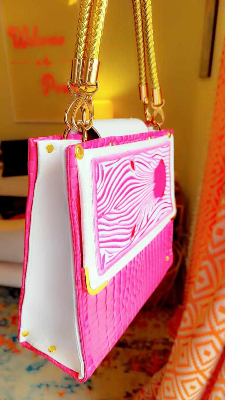 Handmade Soderena Original Handbag with pink and white vinyl, gold braided leather handles and gold hardware. Embroidered Zebra detail with interior pocket and Signature Keychain.
