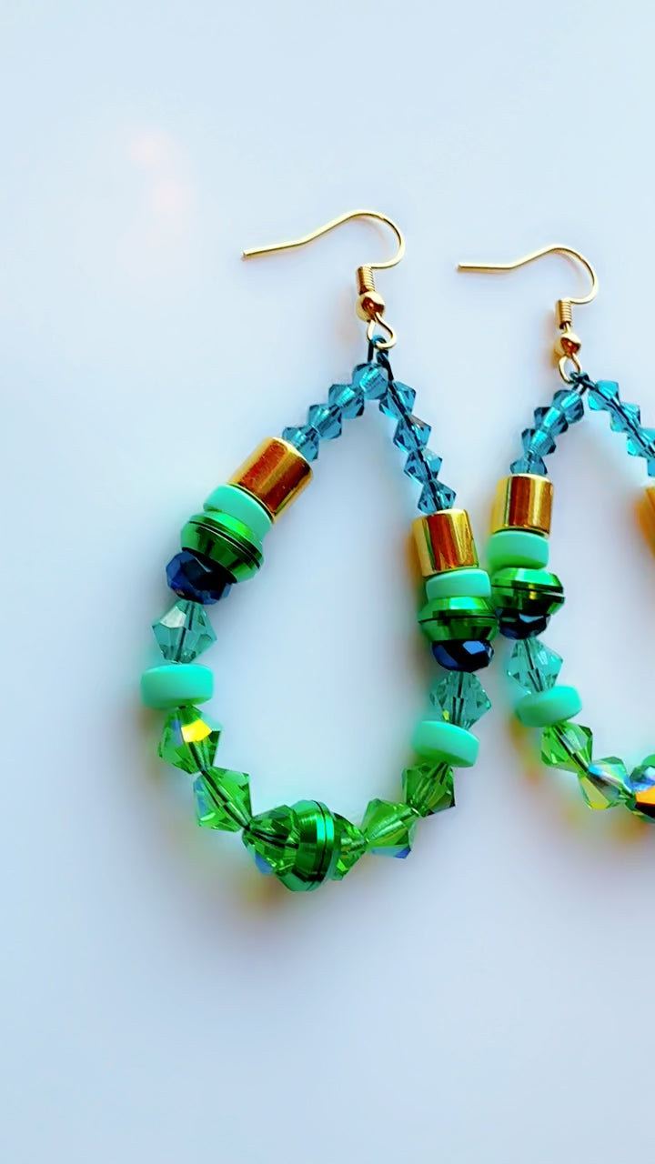 Large Blue and Green Preciosa Crystal and washer earrings…hoop dangle style with gold hook on blue wire.