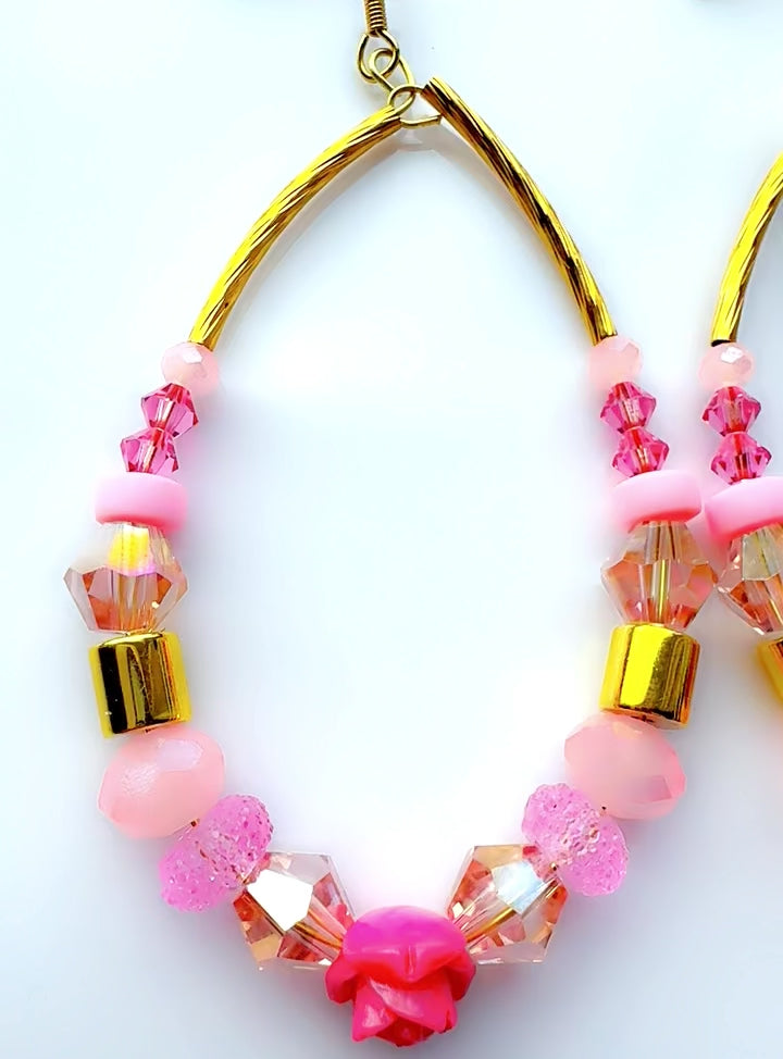 Pink Rose and Preciosa Crystal Earrings with gold detailing…handmade and lightweight. Perfect for summertime and vacations at the beach.