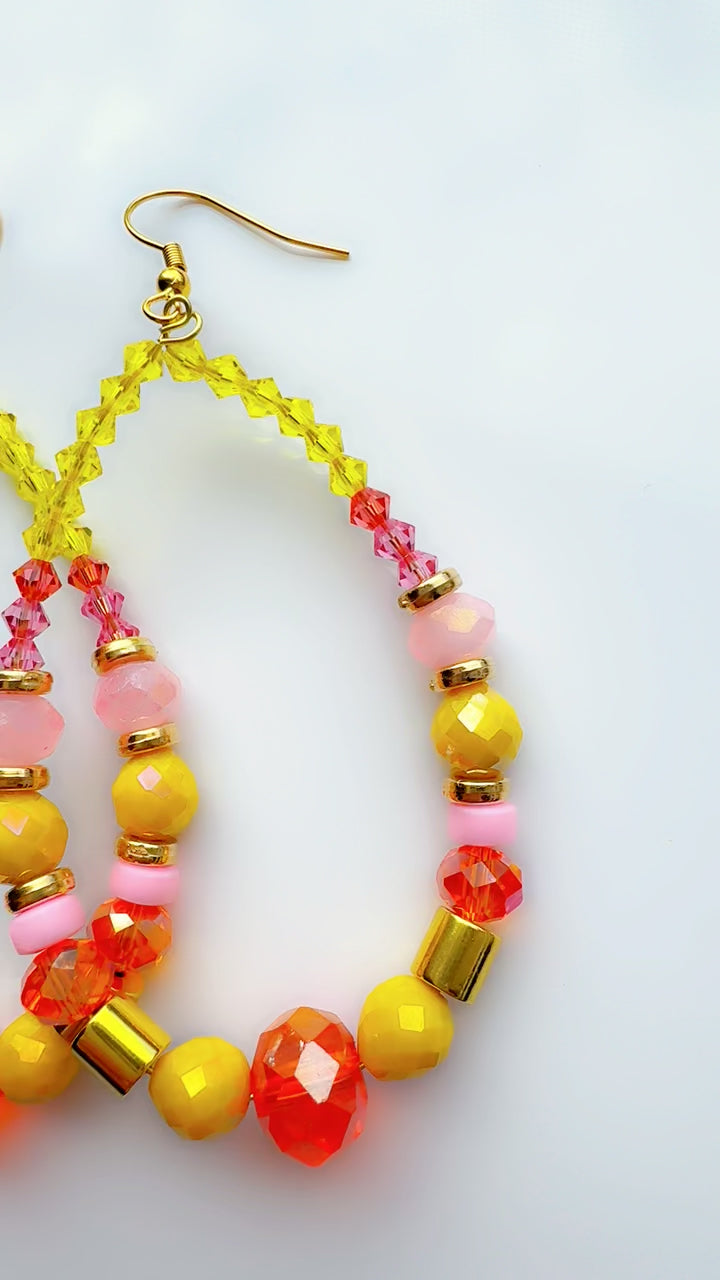 Handmade Yellow Orange and Pink elongated hoop earrings…Preciosa crystals with glass and silicon beads.