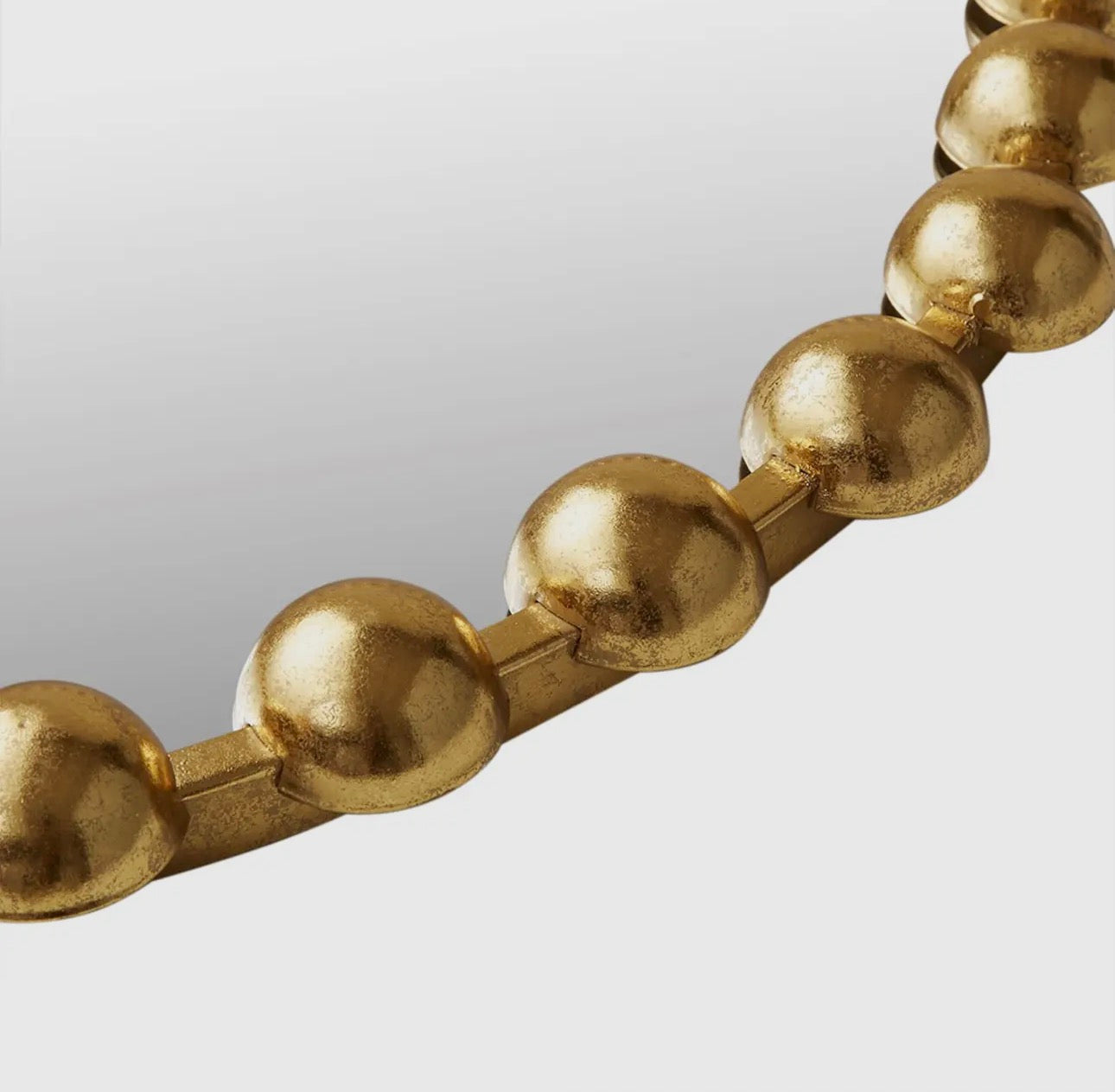 This round mirror features a stylized spherical iron frame finished with an antique metallic gold foil, creating a rich sheen and light speckled, distressed pattern effect. The keyhole hook fixture on the back of the mirror allows for effortless hanging on your wall. Incorporate this wall decor mirror into any room or space, for the perfect combination of modern glam and flair. Wipe clean with damp cloth and handle with care.