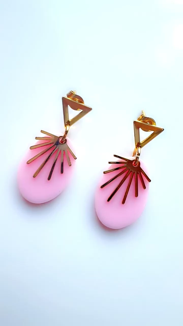 Pink Resin and Goldtone Brass earrings with sunburst detailing