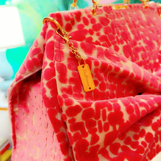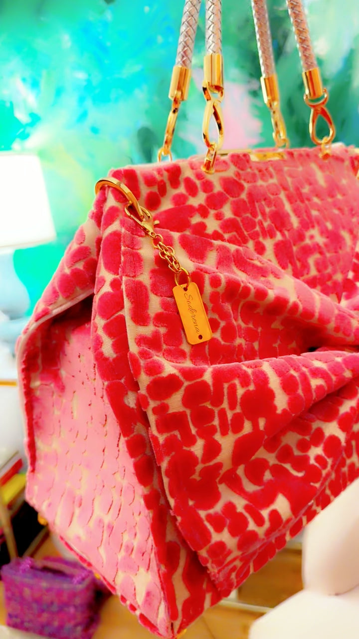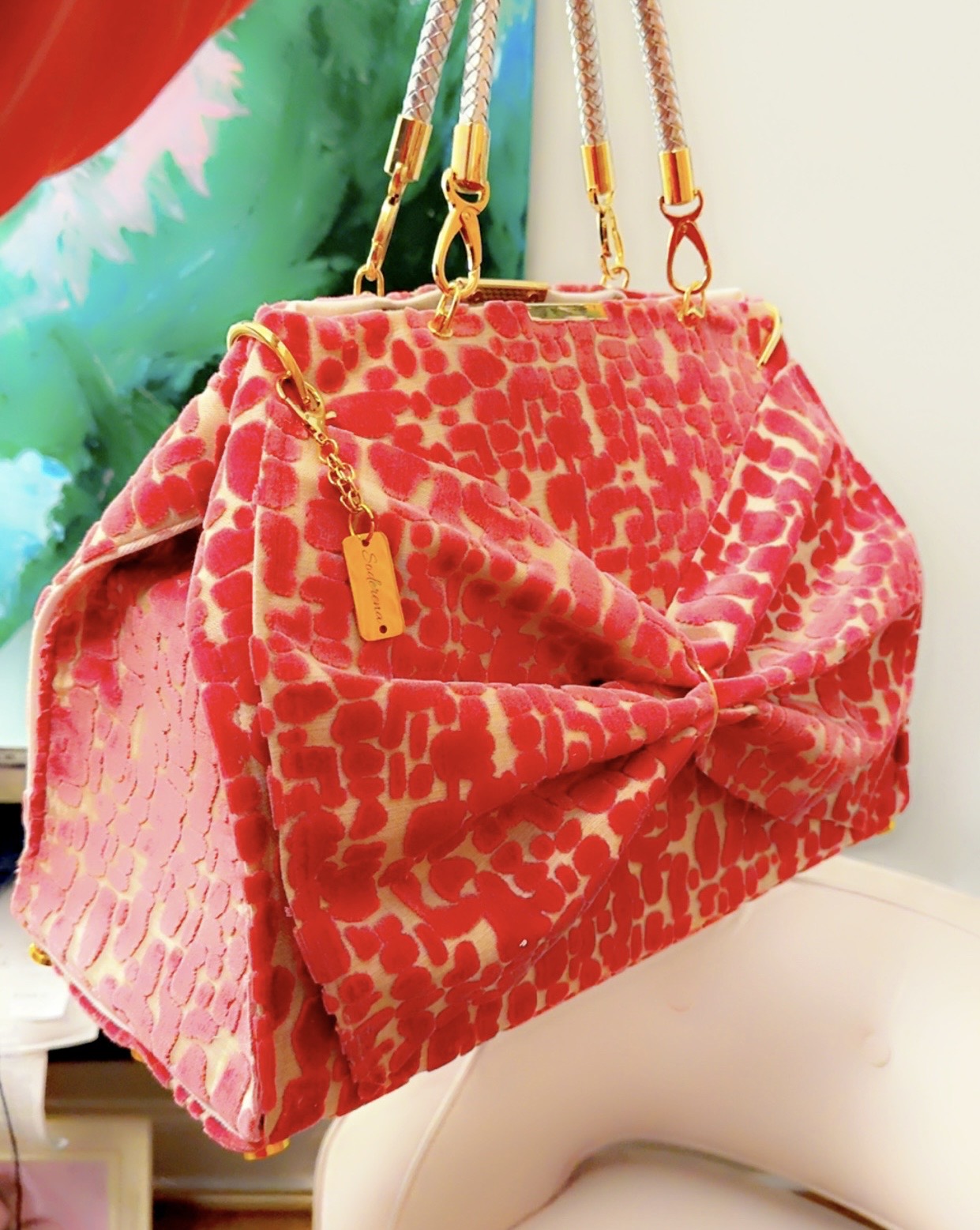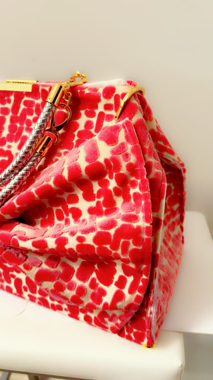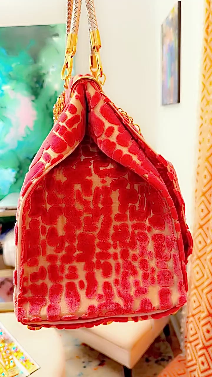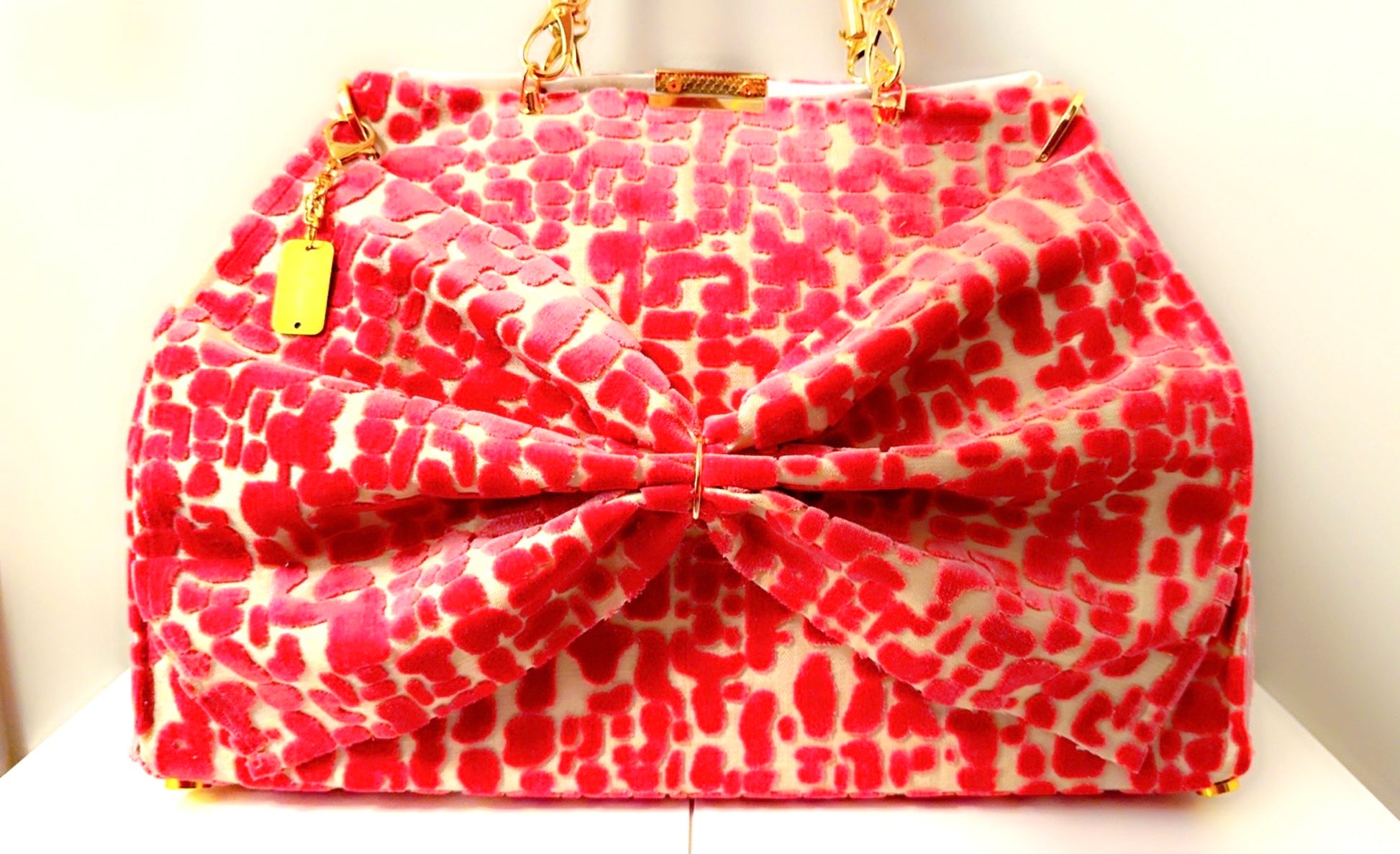 Handmade pink raised velvet large Dr style handbag with gold handles and organizer bag insert. Gold hardware detailing and large bowfront. Design her favorite! Perfect for travel… Or having lunch at the country club with friends.