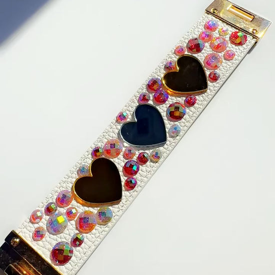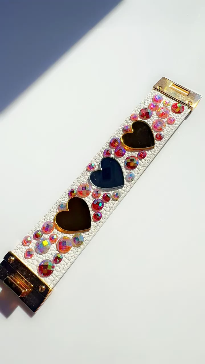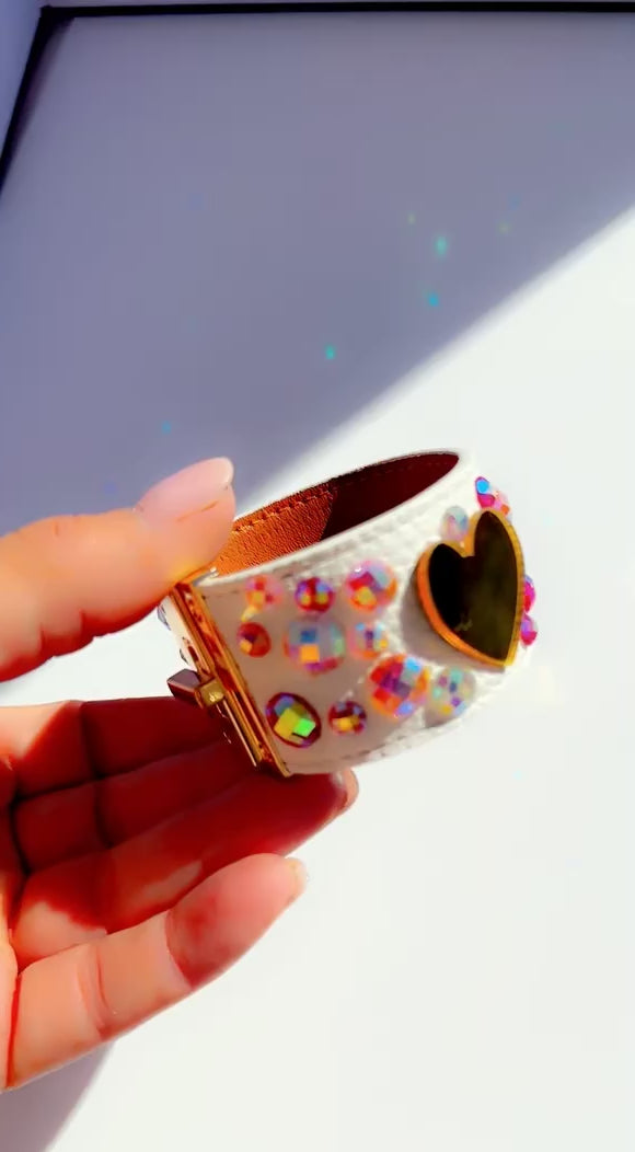 Handmade white vegan leather cuff bracelet with mirror, hearts, and rhinestone gems… Perfect for Valentine’s Day or just a gift for that special person you love! Also a great gift for bridesmaids or your best friends. Looks great with anything red pink or white!