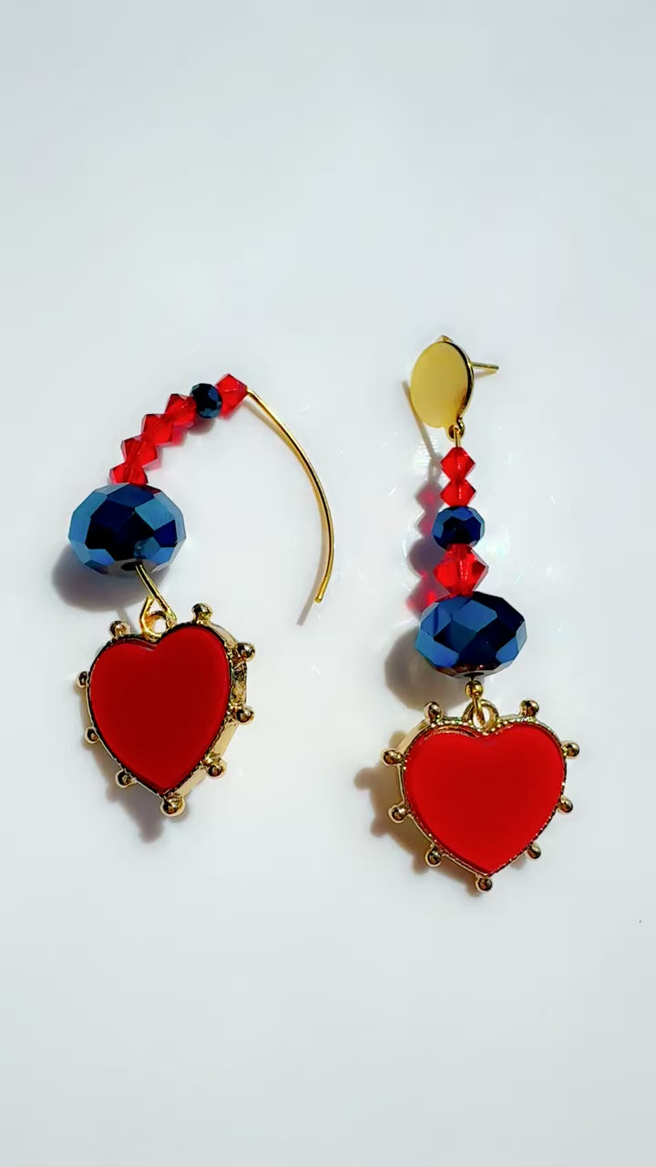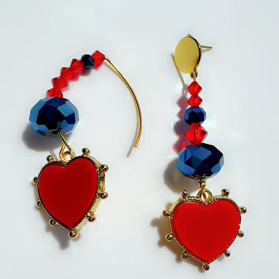 Red Preciosa Crystal Earrings with blue glass beads and enamel heart pendant. Mix Match Style….