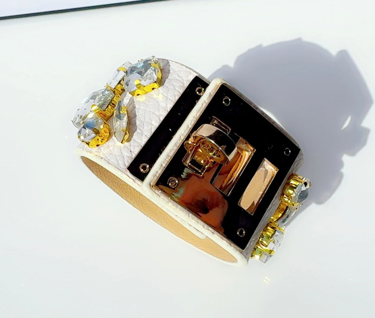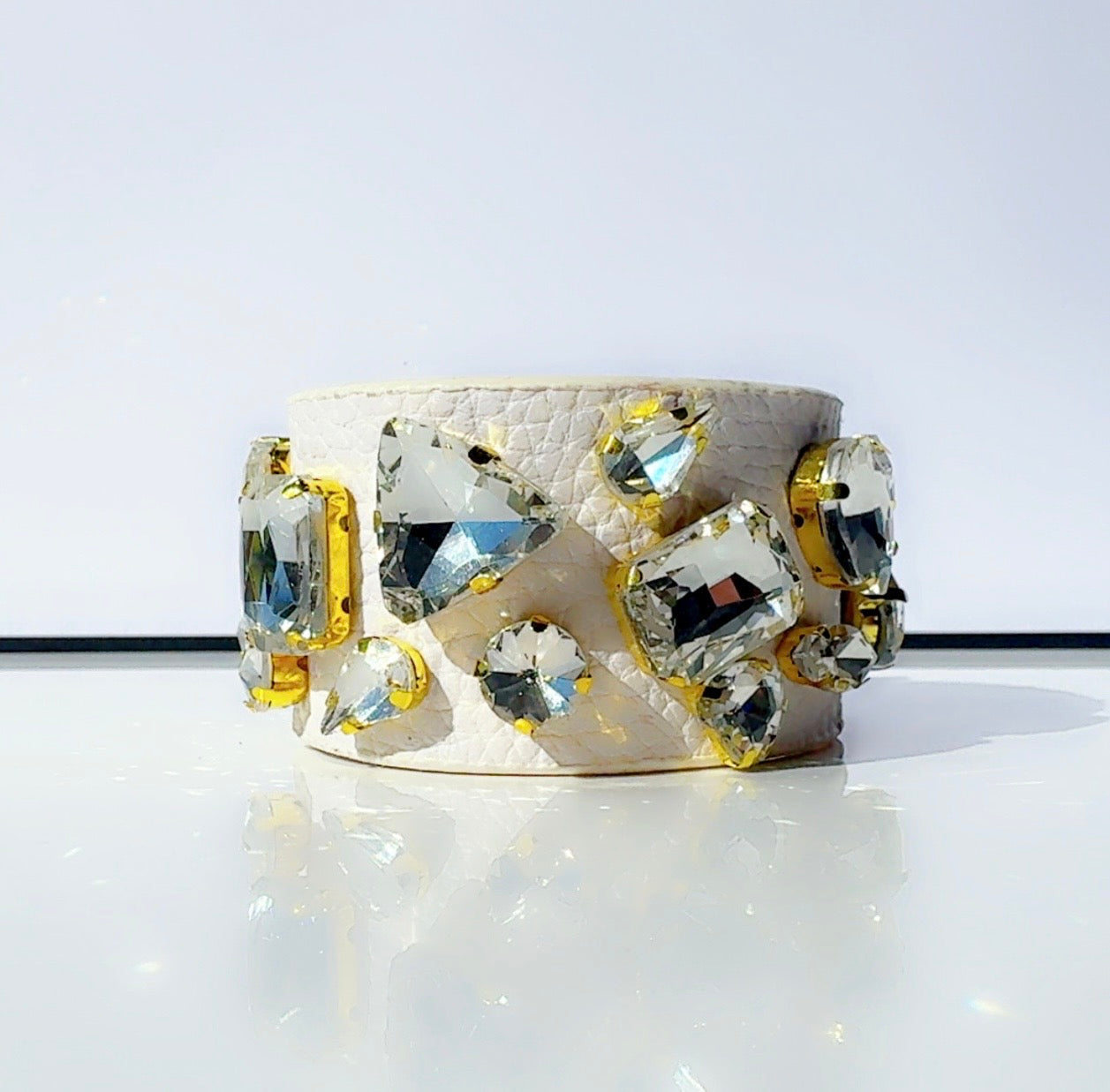Handmade White Leather Cuff Bracelet with large rhinestones… gold clasp.