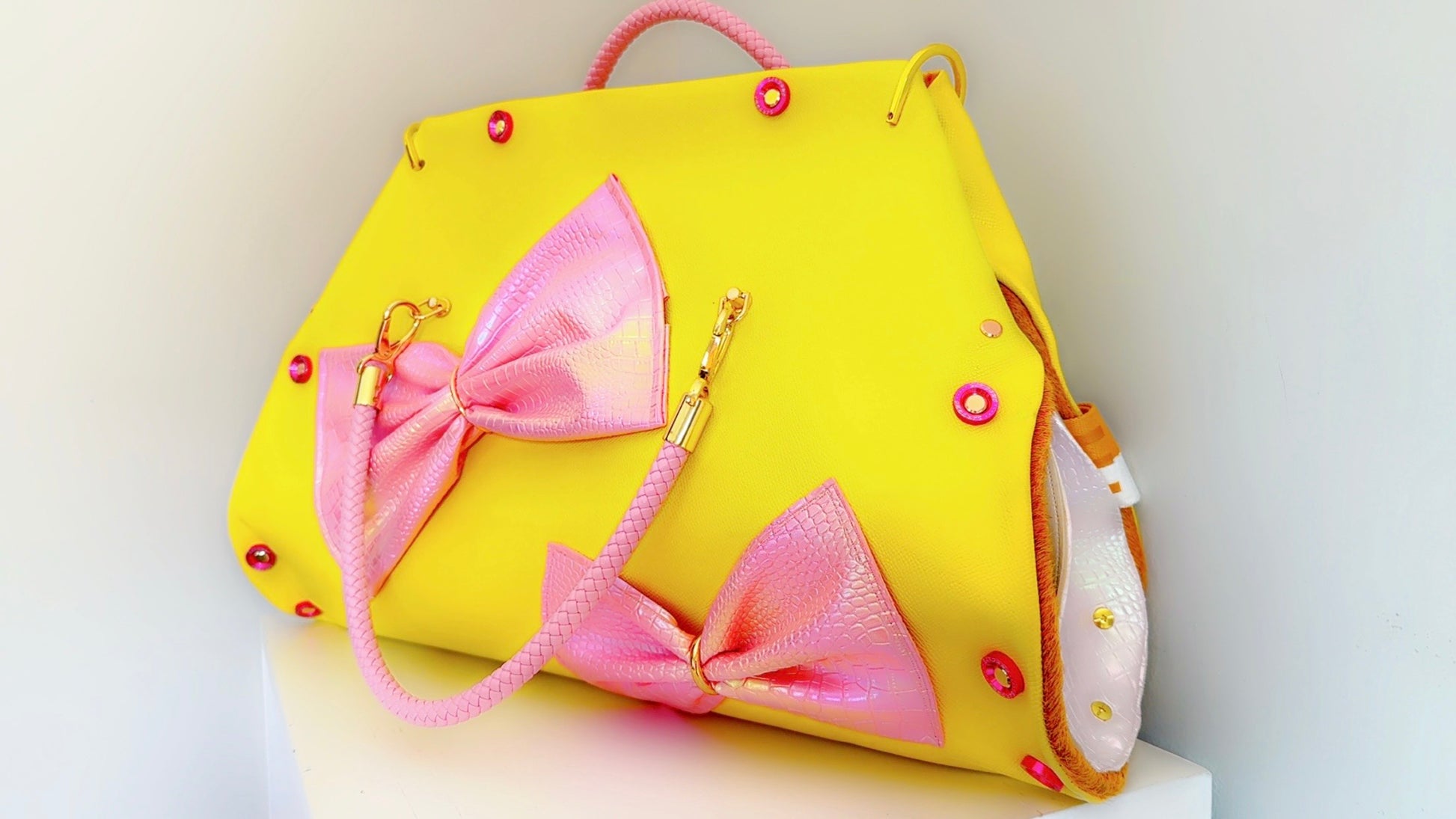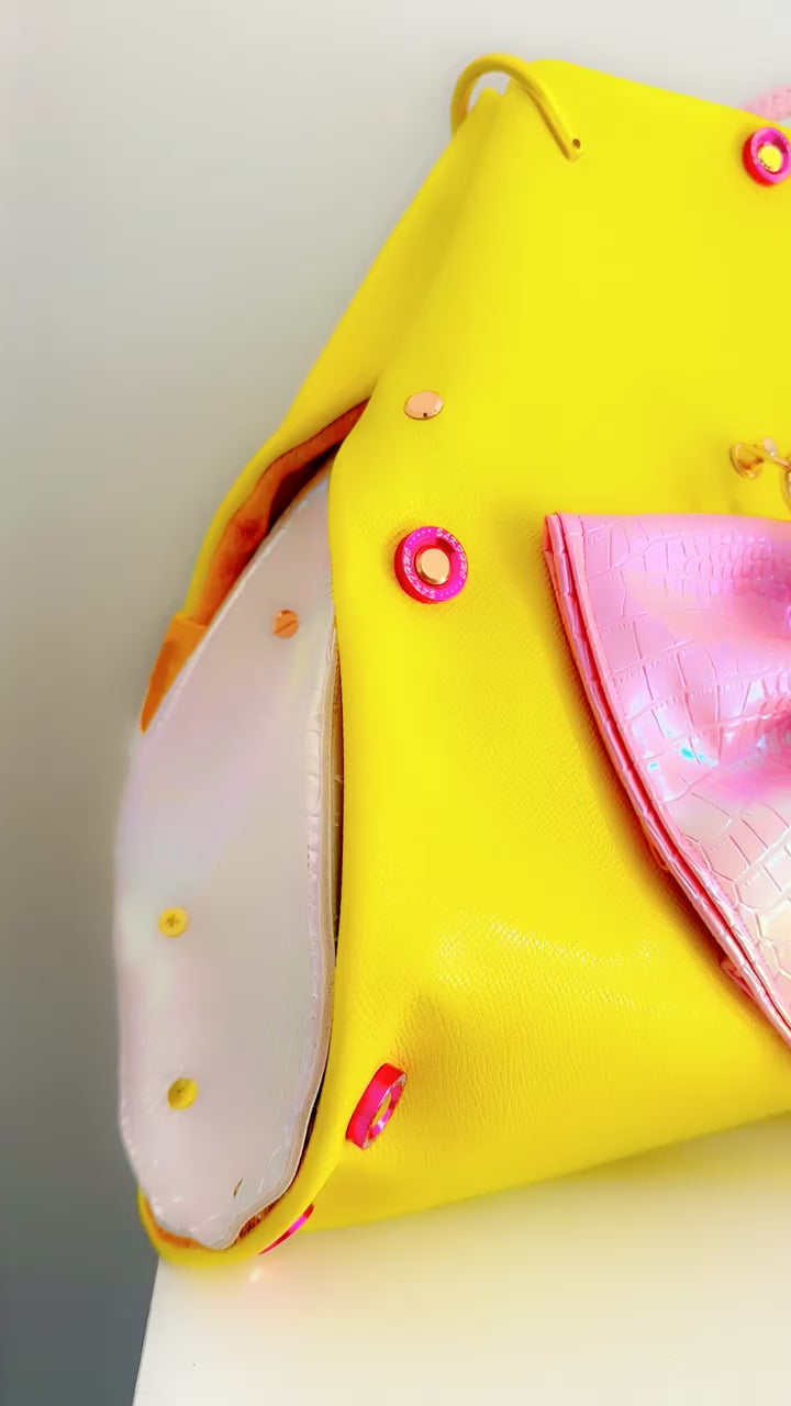 Large Oversized Yellow Italian leather with genuine leather hide interior… Pink crocodile vinyl bow detailing, white crocodile vinyl sides on the bag. Pink braided leather handles with gold and rose gold hardware, with hot pink washer, hardware detailing. Cross body love strap included.