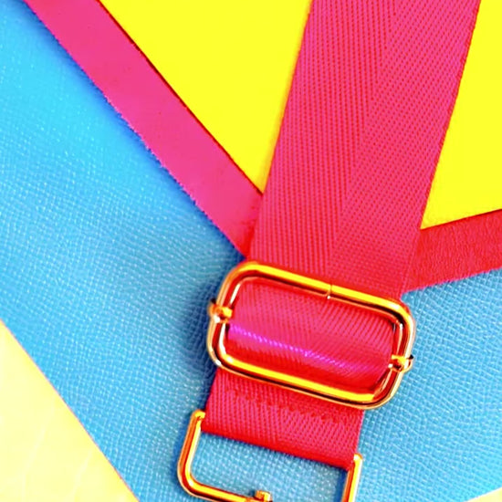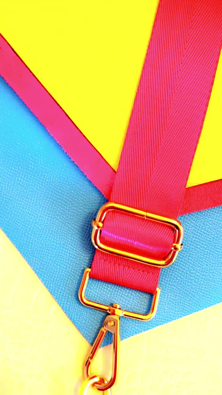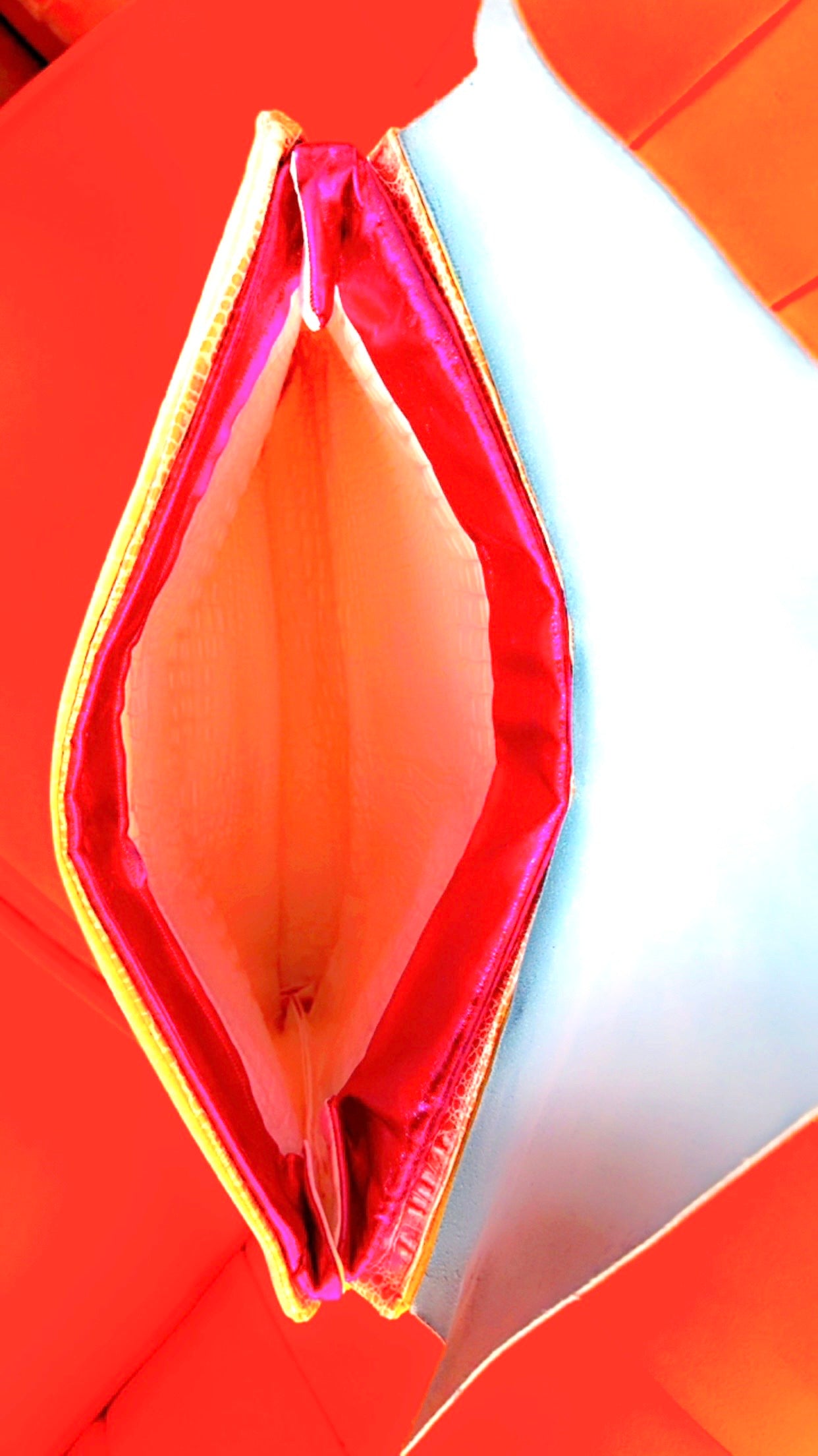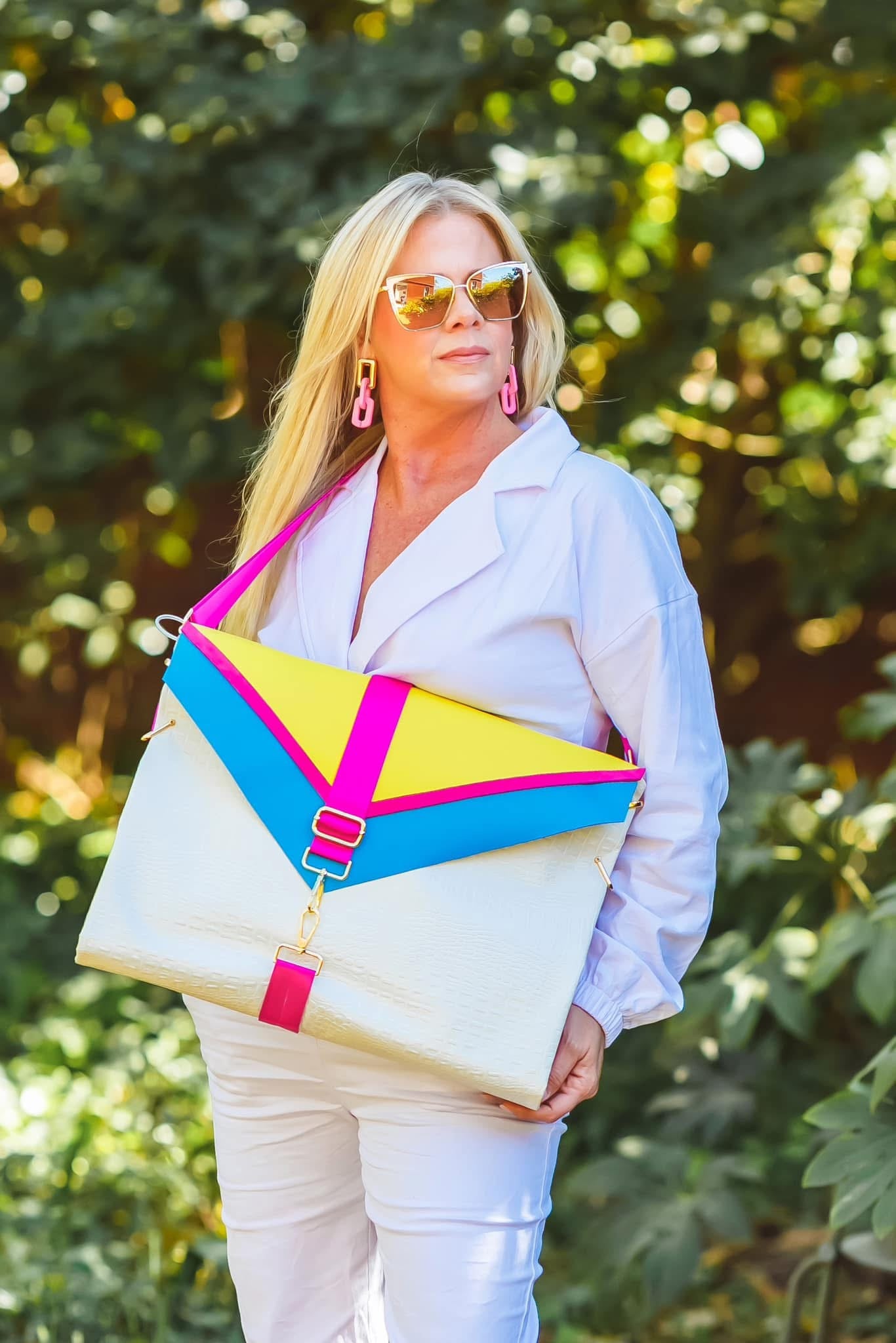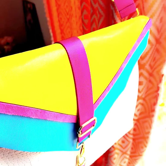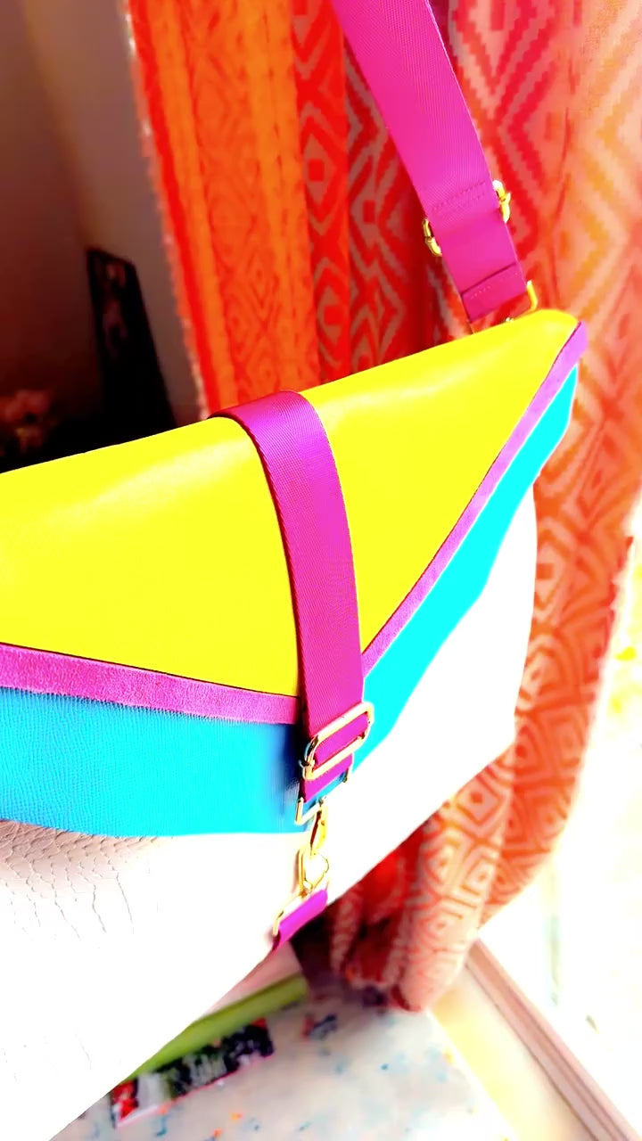 Handmade White vinyl messenger bag with pink yellow and blue leather detailing…with hot pink crossbody strap. Gold tone hardware