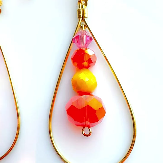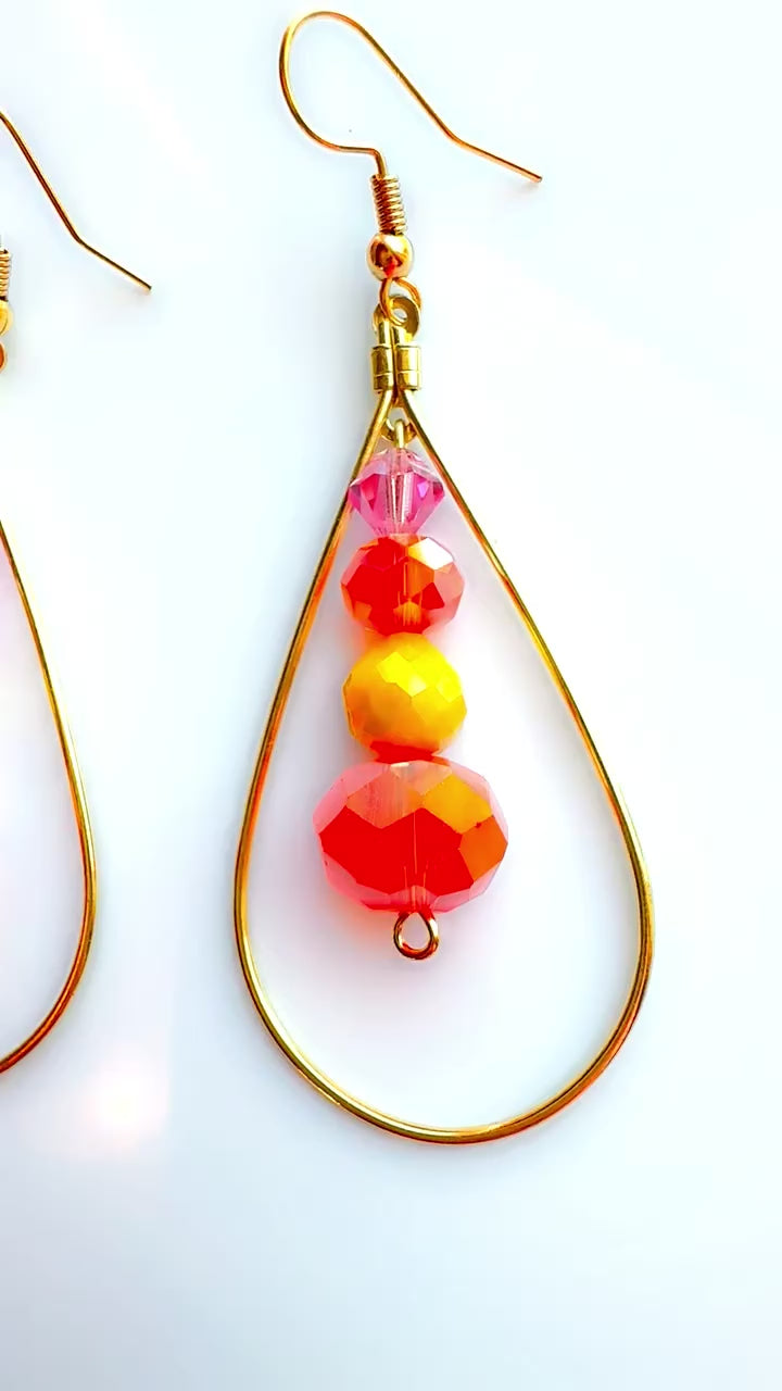 Orange and yellow Glass bead dangle earrings on a gold tone hoop with gold tone hook