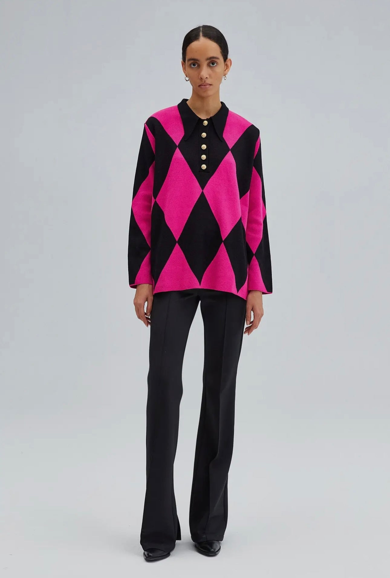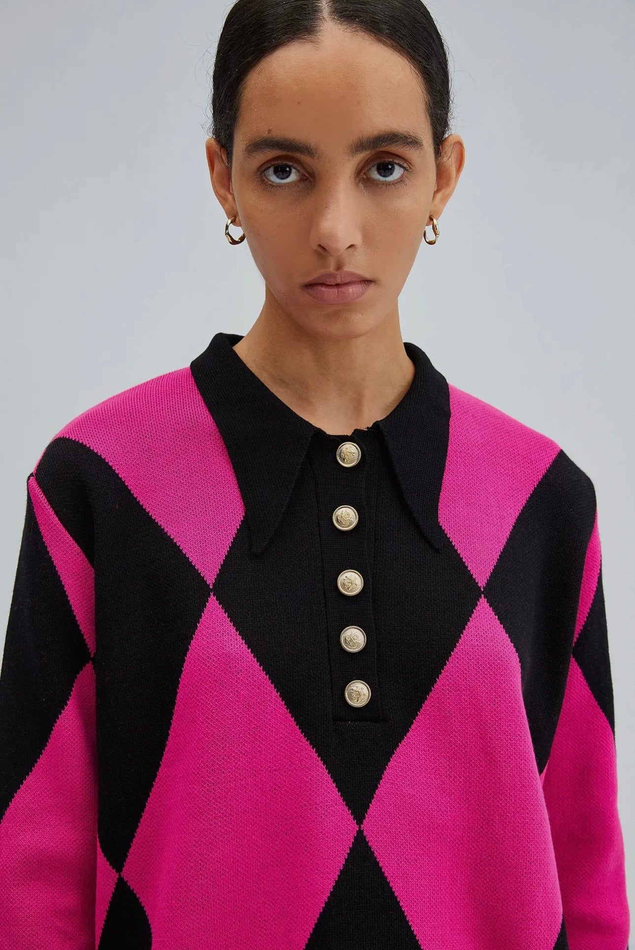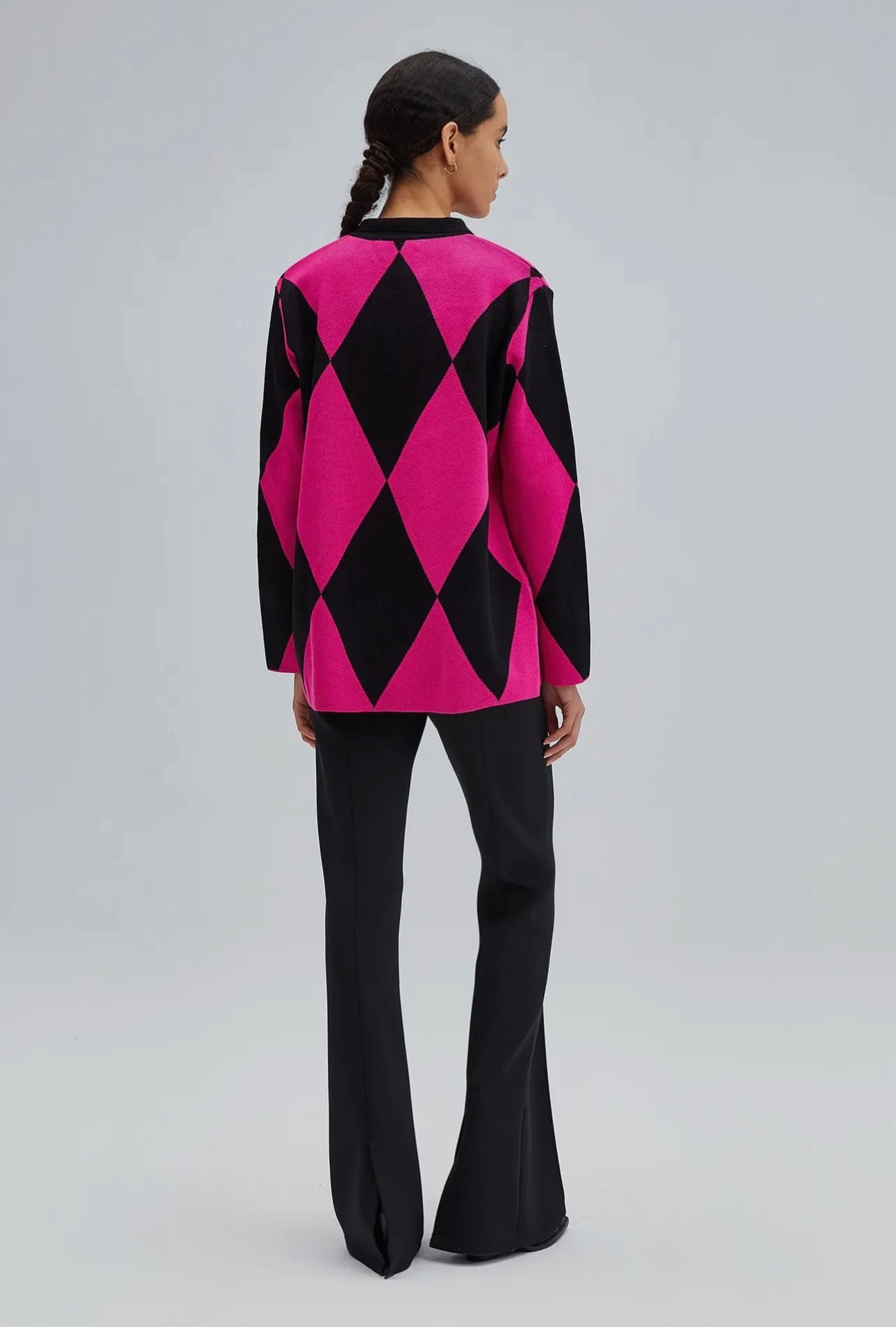 Hot Pink and Black Diamond Sweater with gold buttons. Very comfortable and perfect for work!