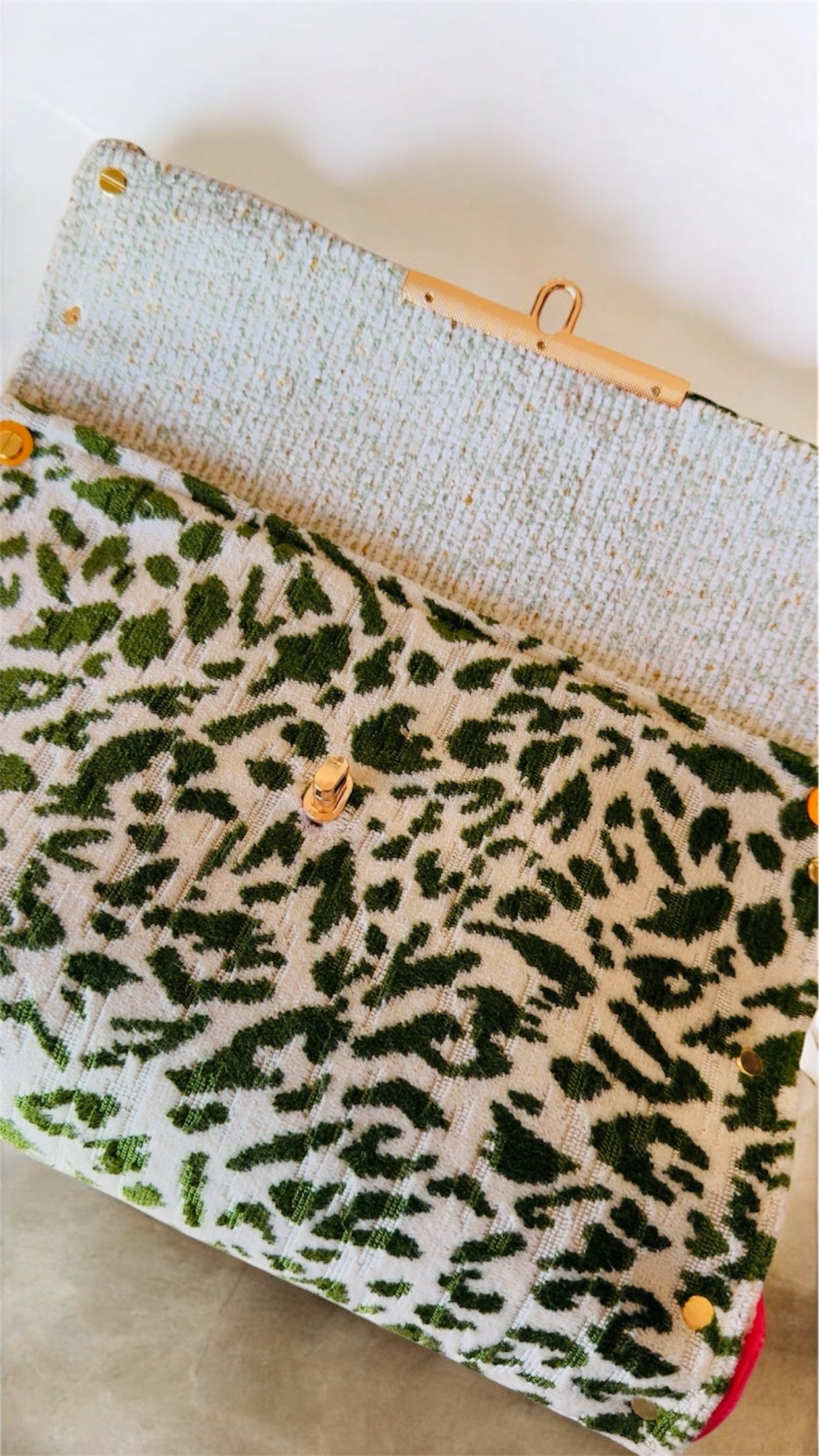 Handmade Chenille clutch with twist clasp closure…pink suede side panels and light green tweed interior.