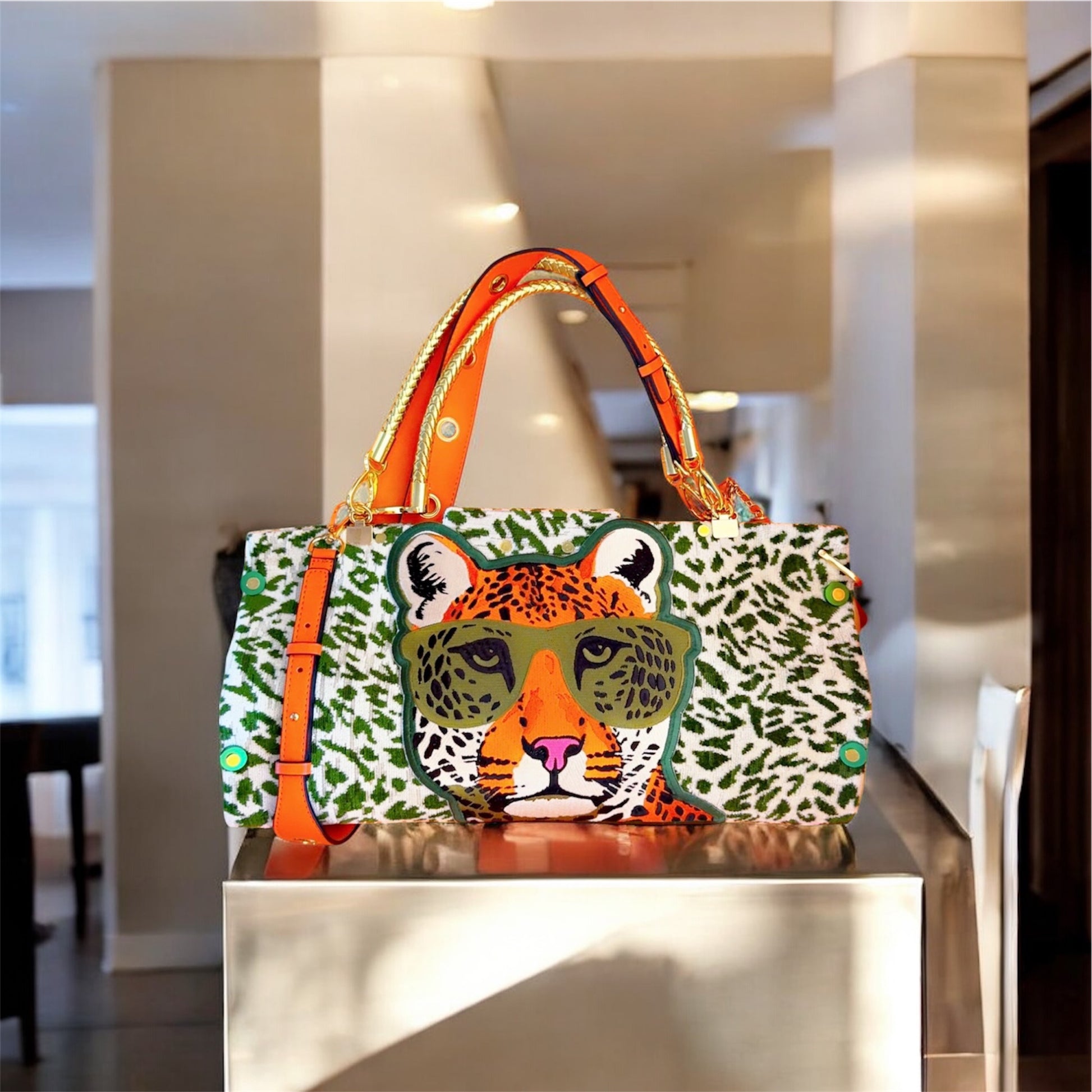Handmade shady leopard long clutch bag with gold handles and orange leather tassel. Embroidered patch detailing on the front with chrome washer detailing.