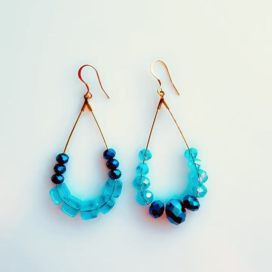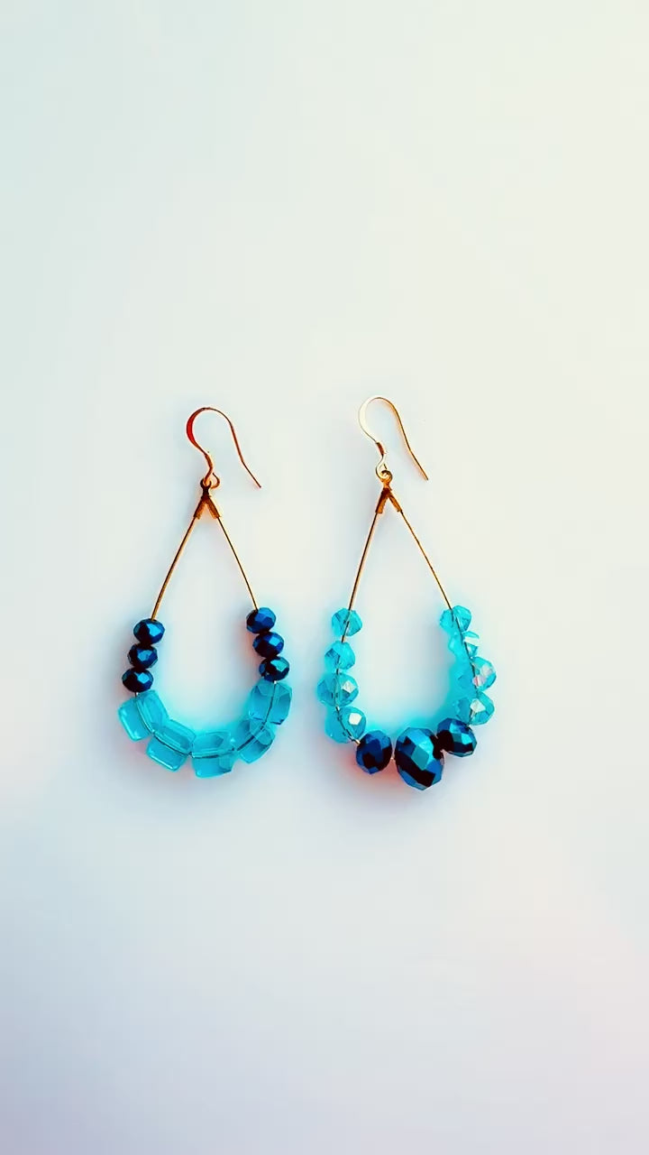 Midnight and Carolina blue glass bead long hoop dangle.