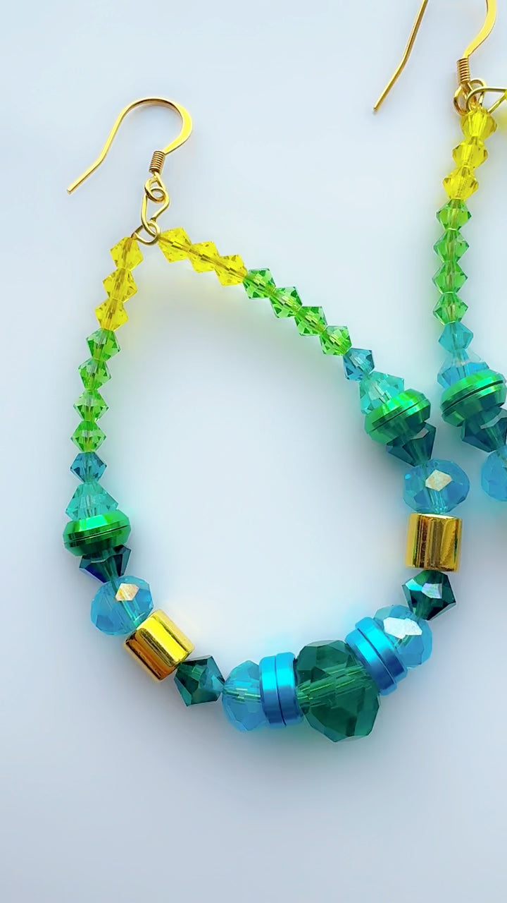 Green yellow and blue Perciosa crystals with chrome washer charms and glass beads. Handmade by Amy Soderena
