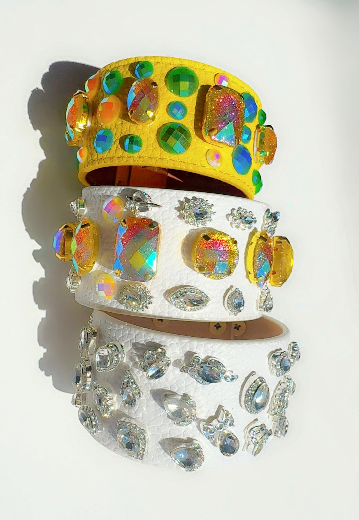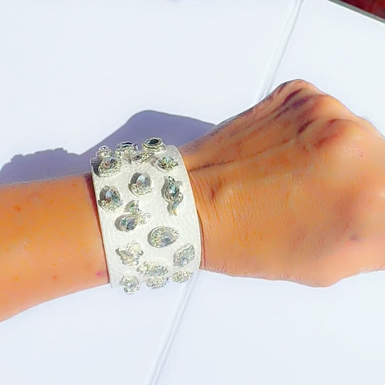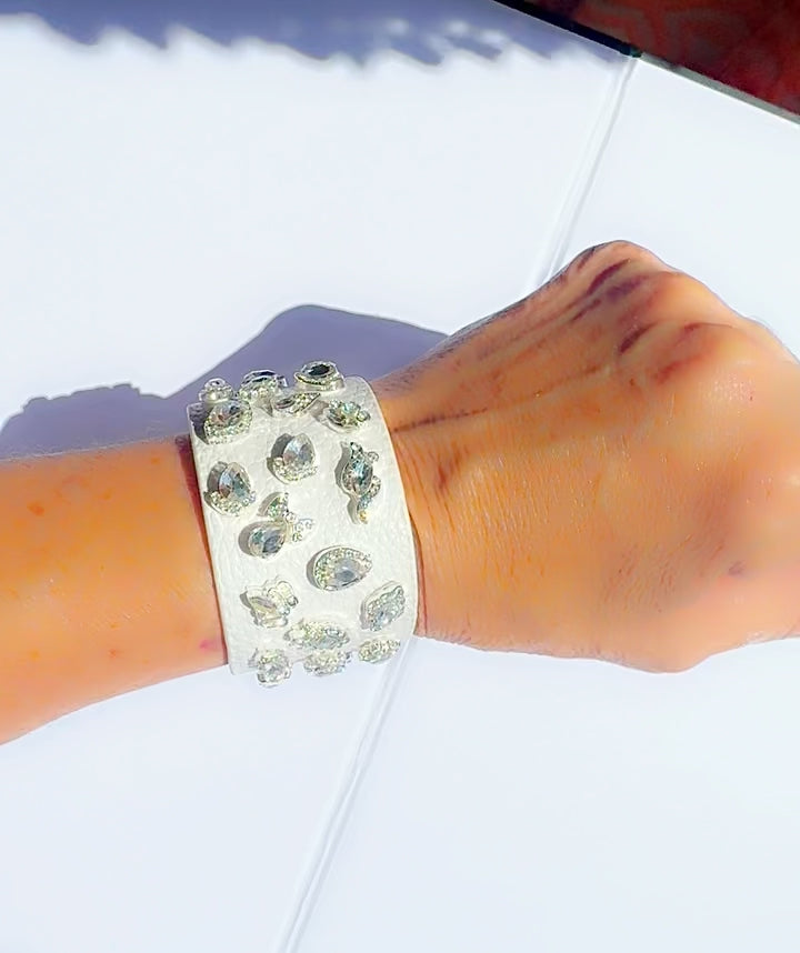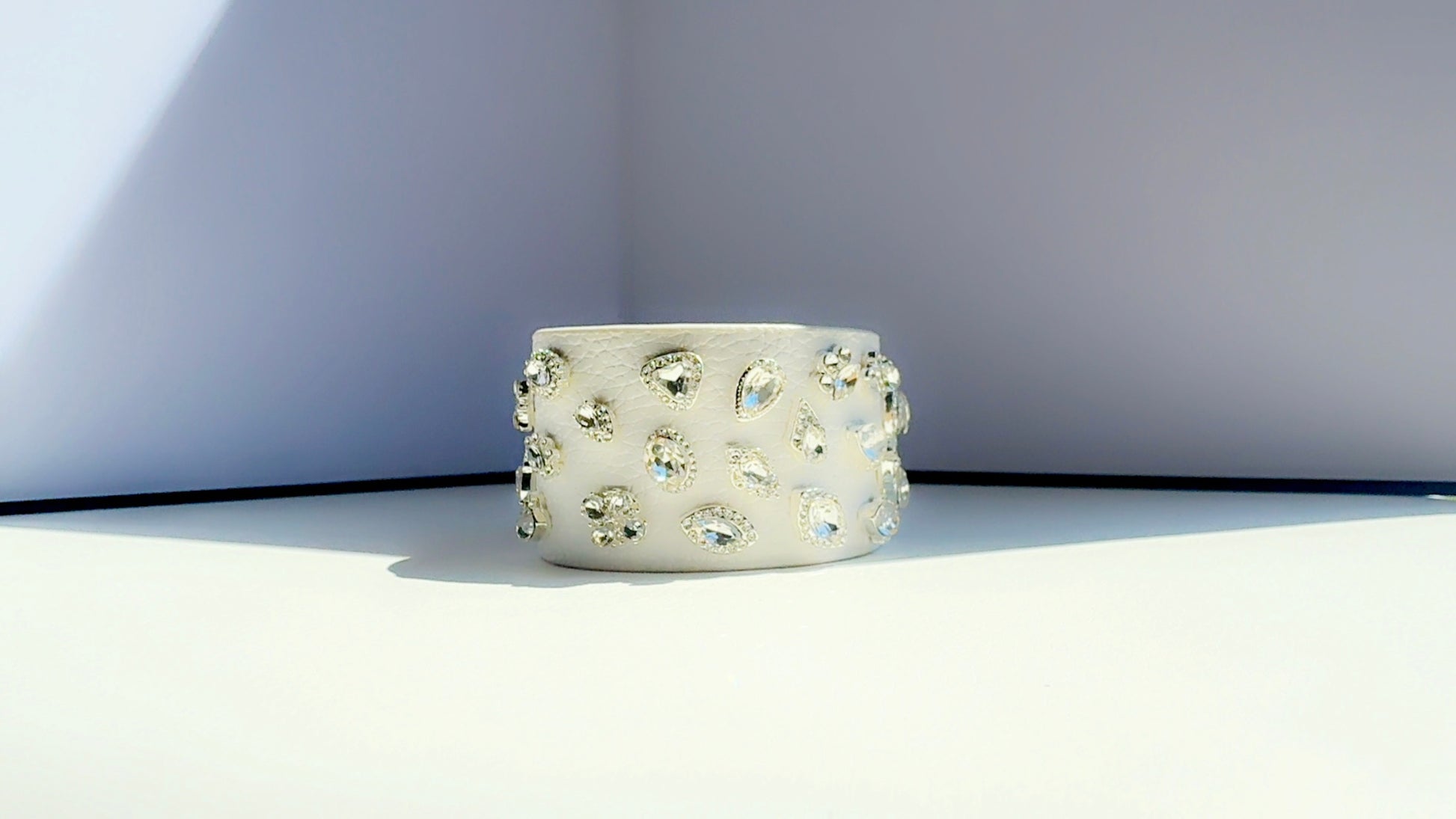 White leather cuff bracelet with silver clasp, and silver sparkle accents… Handmade and not on Amazon!