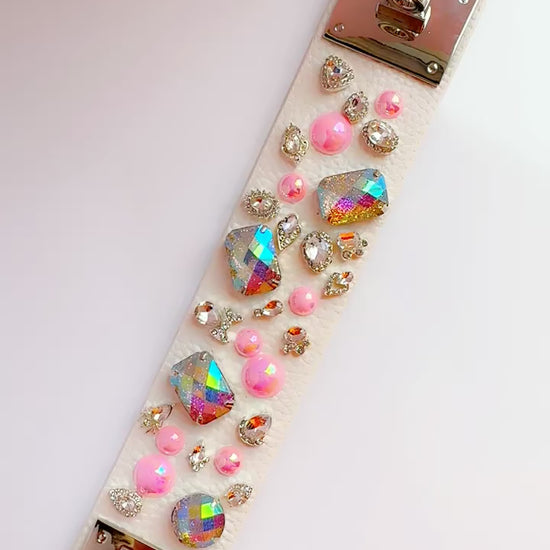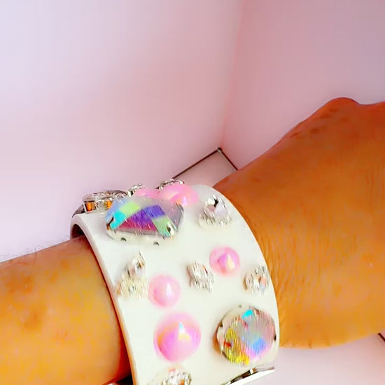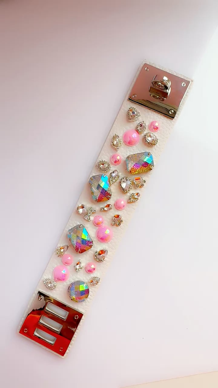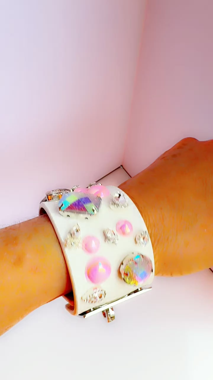 Handmade White leather cuff bracelet adorned with rhinestones and pink gems… Looks great with white jeans and a pink top or a white dress. I wear mine around the pool and get lots of compliments!