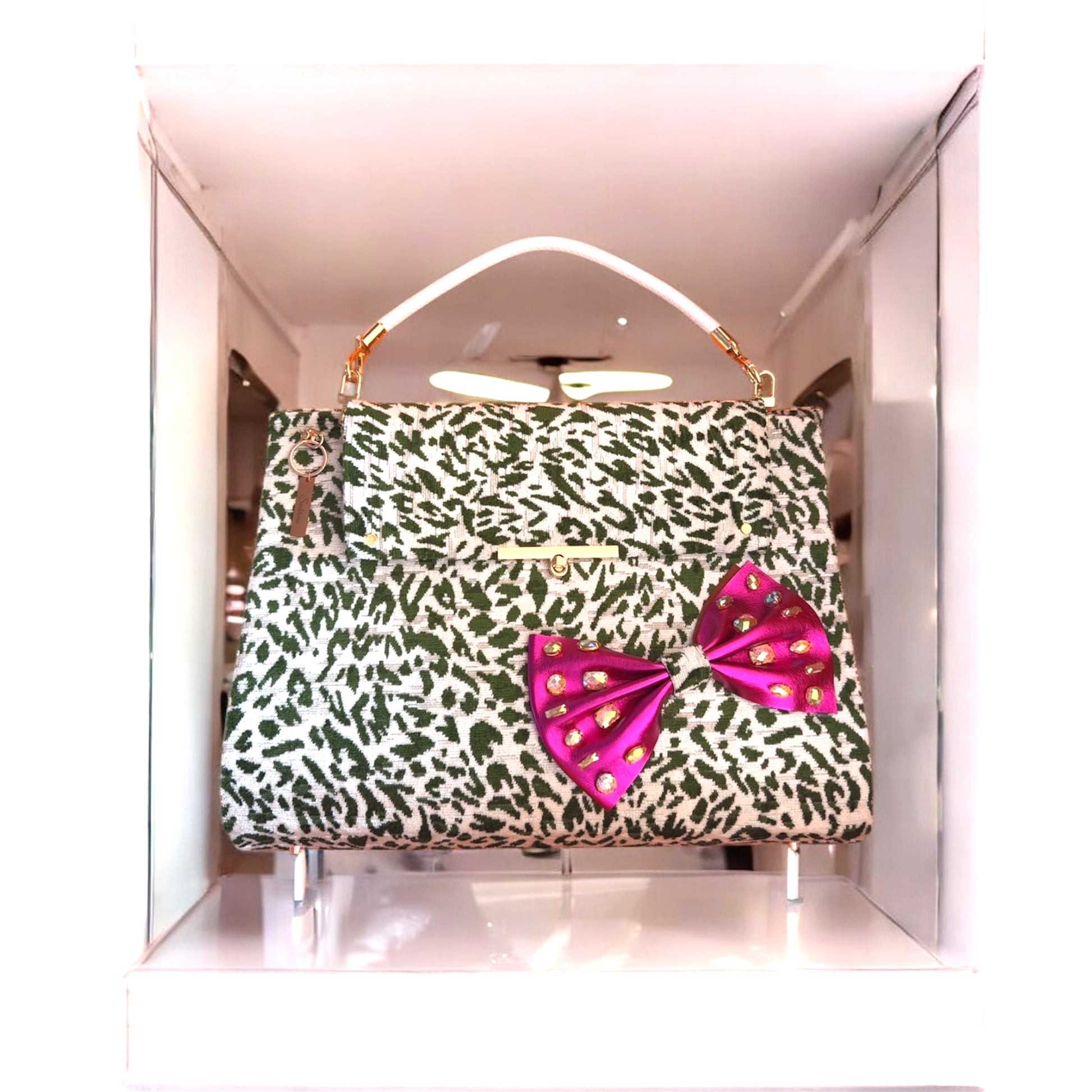 Handmade Large tote bag with green and white cheetah pattern with hot pink vinyl bow. Perfect for making statements. Sturdy with pink vinyl sides and white leather braided handle