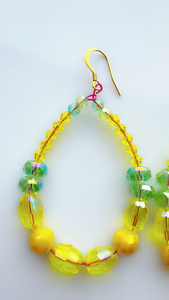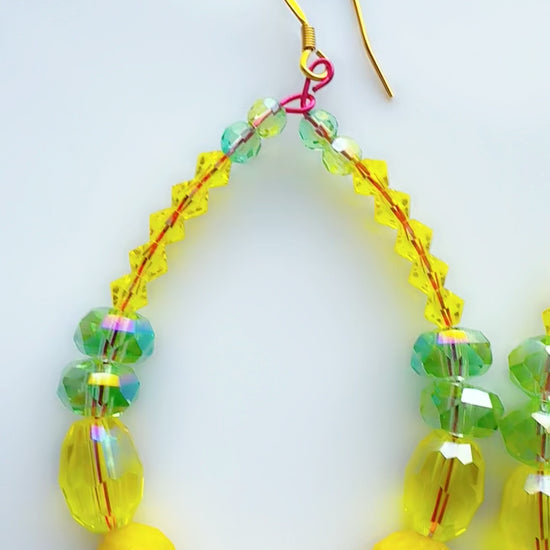 Yellow and green Preciosa Crystal Earrings on hot pink wire…delicate and lightweight. Perfect for Spring and Summer! Looks great with blues and greens. Handmade and won’t weigh your earlobes down!